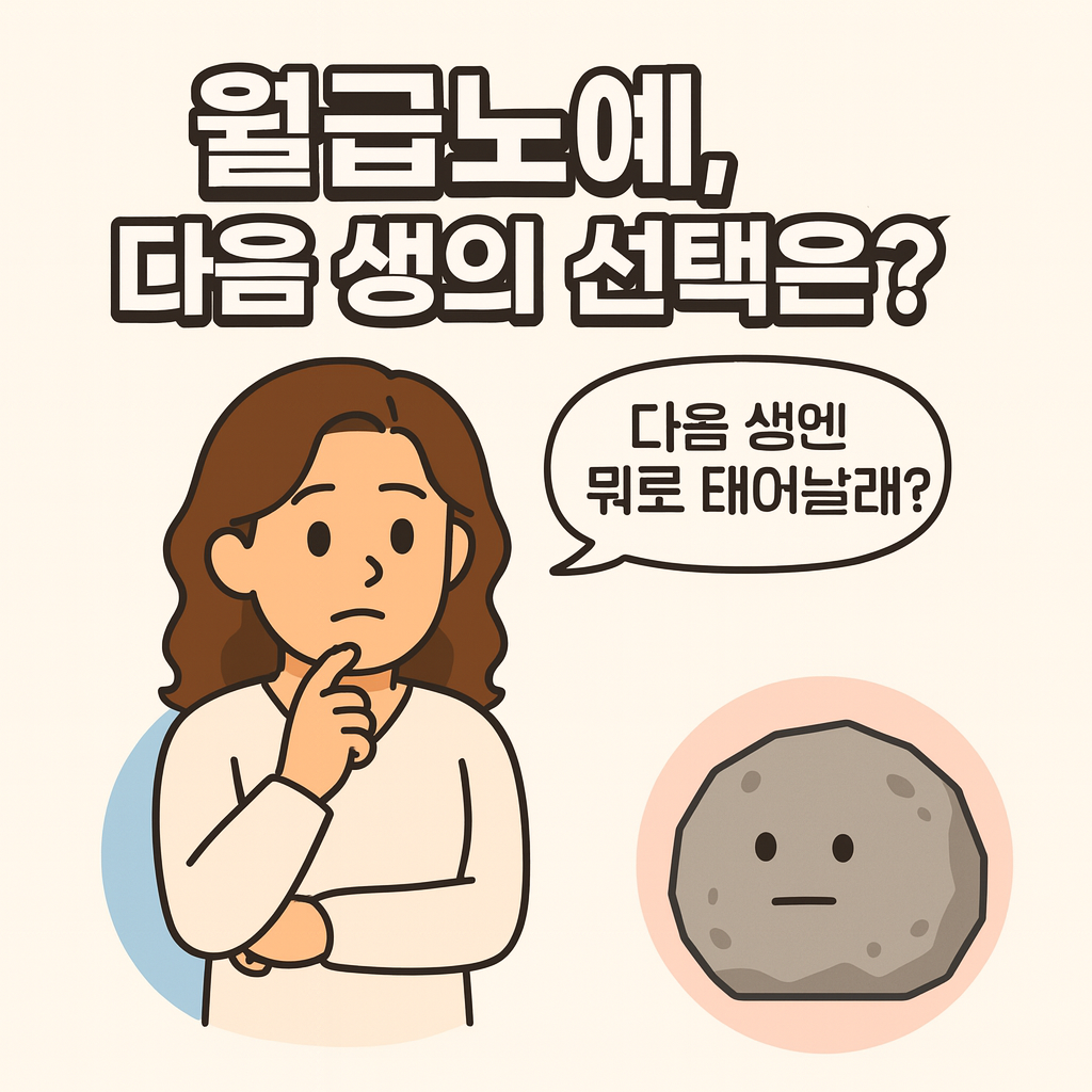 오무사가 손가락을 턱에 대고 고민하는 표정으로 서 있고, 옆 말풍선에는 “다음 생엔 뭐로 태어날래?”라고 쓰여 있다. 오른쪽에는 무표정한 돌이 그려져 있으며, 상단에는 굵은 글씨로 “월급노예, 다음 생의 선택은?”이라는 문구가 적혀 있다. 오무퇴 블로그 애니메이션 이미지