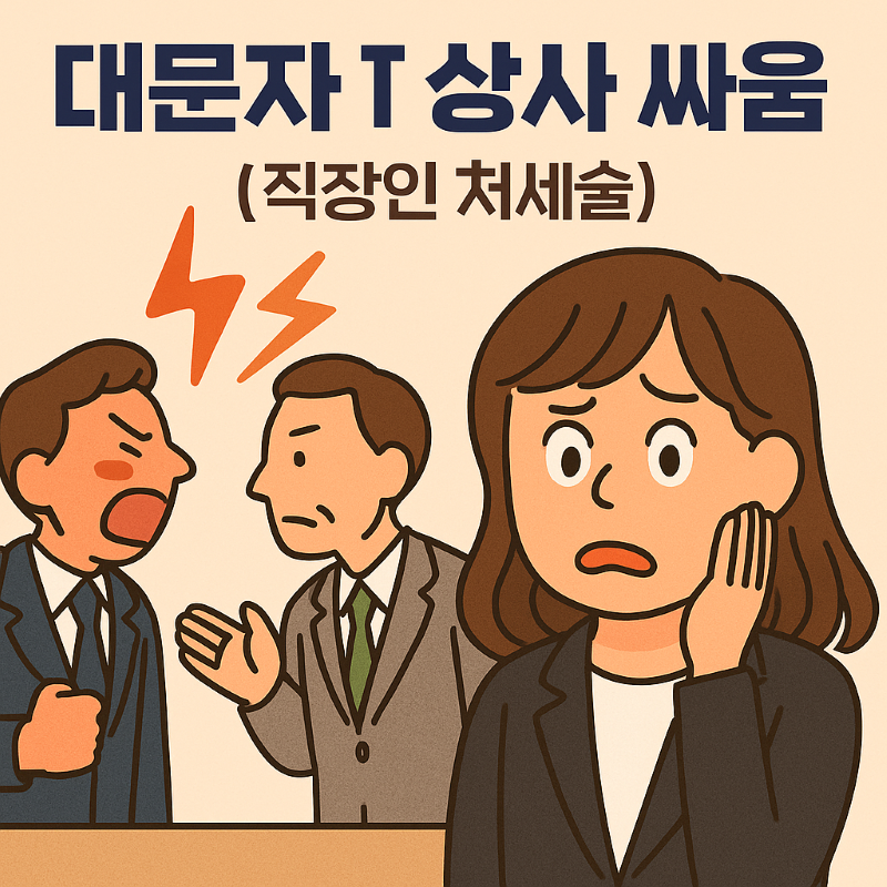 회사에서 상사들끼리 싸울 때, 옆에 있는 우리는 어떻게 처신해야 할까? 대문자 T 상사의 특징부터 처세술, 위로법까지 오무퇴가 알려드림!아 진짜... 그날만 생각하면 지금도 심장이 쿵쾅거려.회사에서 상사들끼리 싸우는 그 순간, 옆에 앉은 나는 혼이 나가는 줄 알았다고.사건의 전말은 이랬어.야심 차게 초도 발주했던 신제품이 나름 괜찮은 반응을 얻었고, 추가 발주 준비 중이었지.🎯 그런데 문제는…갑자기 영업팀에서 제조사 바꾸자고?원가 줄여야 한다면서 제조까지 터치하겠다고 들이댄 거야.그 순간, 내 머릿속엔 이 말밖에 안 떠오르더라.“대문자 T 팀장님들, 움직이십니다…”상품개발팀의 대문자 T 팀장님,그리고 우리 마케팅팀의 또 다른 대문자 T 팀장님이 딱! 반응하셨지.영업 부장이 며칠을 들이대도, 꿈쩍도 안..