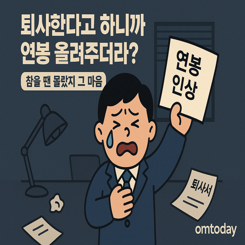 직장 스트레스가 쌓일 대로 쌓인 어느 날, 퇴사 고민을 꺼냈더니 연봉이 올랐다? 열심히 일하는 사람보다 티내는 사람이 더 보상받는 구조 속, 번아웃 증상이 심해질 수밖에 없는 현실. 오무사가 분석해본다. “참을 땐 몰랐지.퇴사하겠다고 하자 연봉이 올라버릴 줄은…”우리 회사,3년째 매출 하락. 3년째 연봉 동결.“조금만 참자, 프로젝트 잘되고 있으니까.”대표님 말에 기대고,야근하고, 팀원 커버하고, PPT도 대표님 스타일 맞춰가며 버텼다.성과 내고 싶었거든.그동안 고생한 걸 그냥 흘려보내기 싫었거든. 그러다 어느 날,영업팀장이 사표 냈다는 소문이 사무실을 돌았다.근데 솔직히 말하자면…그 팀장님,진짜 일 안 하는 걸로 전설급 생존자였거든. “잘 됐다~ 분위기 더 좋아지겠네~”하며 속이 후련한 눈치. 그래서..