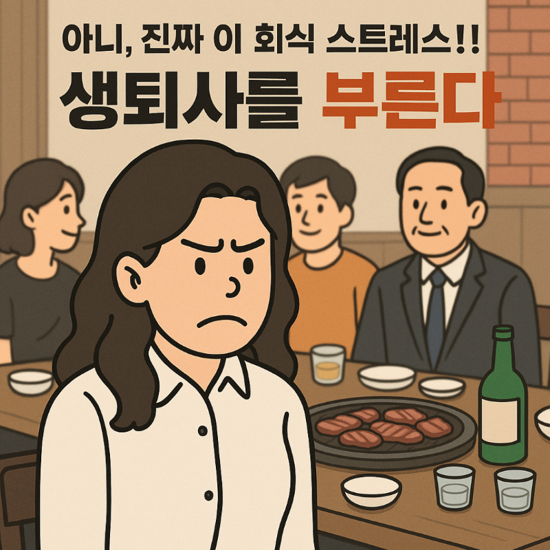 회식 스트레스는 직장 스트레스의 대표 주자. 워라밸 시대에도 반복되는 회식 문화가 퇴사 고민과 번아웃을 부르는 이유, 생생하게 보여드립니다.아니, 진짜 이 회식 스트레스!! 생퇴사를 부른다.워라밸이 국룰인 이 시점에우리 회사 회식은 7시 강제 집합.심지어 회식 장소까지 이동시간은 덤이고,대표님 오실 때까지 그저 고기만 바라보고 앉아 있어야 한다는 거.이거 진짜... 회식 스트레스가 이렇게까지 직장 스트레스로 번질 일이야...?완전 극보수 '라떼는 말이야' 대표님과 그분을 신처럼 모시는 '충성충성' 실장님은대표님 오실 때까지 고기 한 점 굽지 말라 하심.대표님 영접하고 나면 또 인사 말씀 빌드업 깔고 회식 스타트. 아... 진짜 킹받네:::그래, 그래. 여기까지는 어떻게든 '현생이니까' 참고 버틸 수 있어..